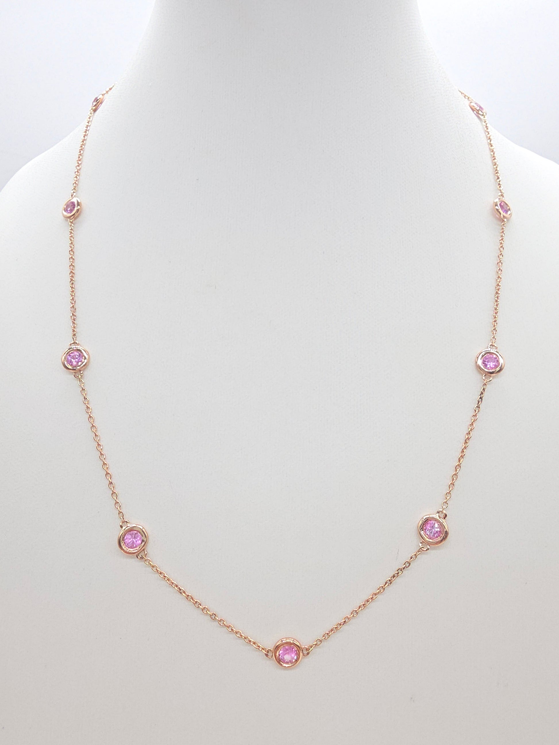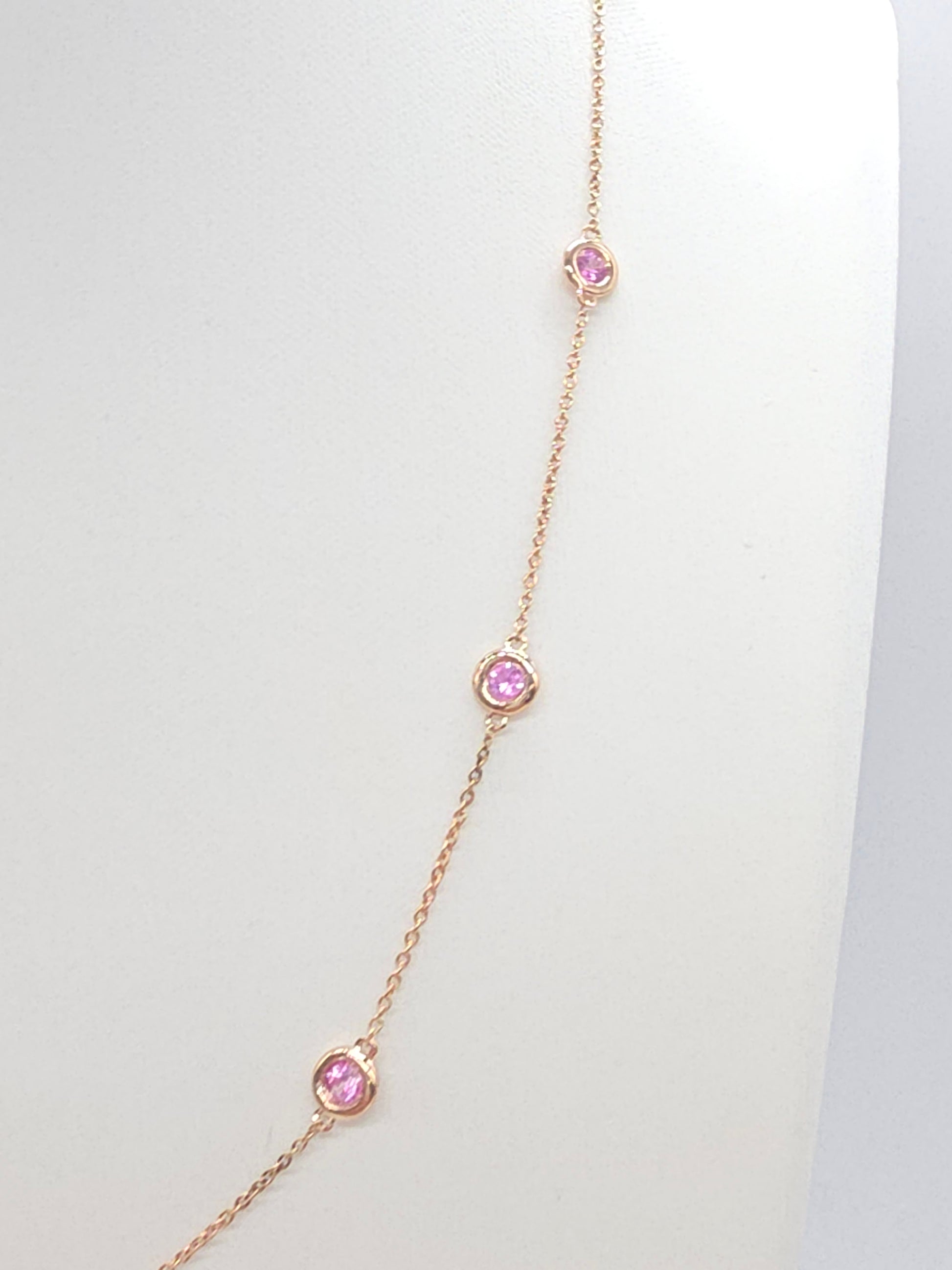 This elegant station necklace showcases a total of 1.48 carats of natural pink sapphires, each bezel-set to highlight their delicate rosy hue. The sapphires are evenly spaced along a 17-inch chain of solid 14 karat yellow gold, offering a refined balance of color and sophistication.
