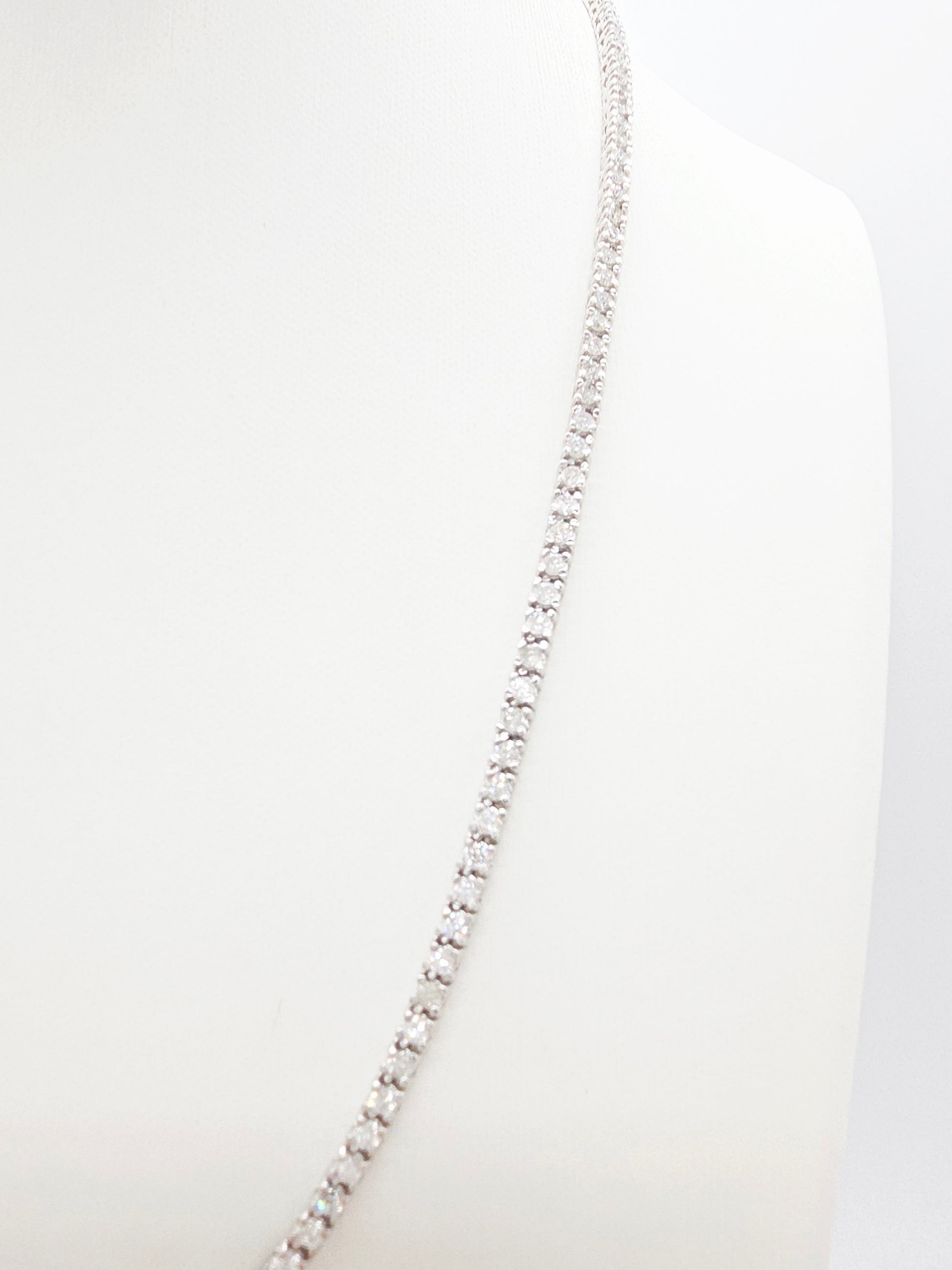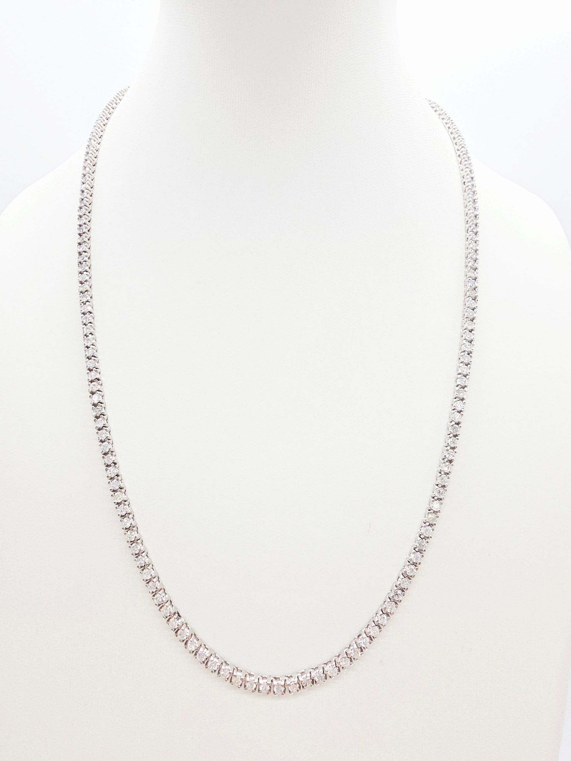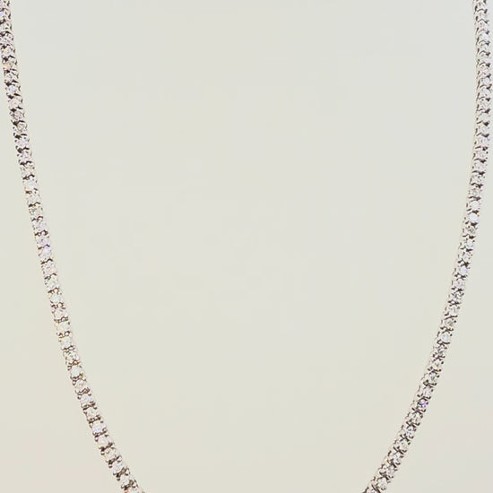 A luxurious and brilliant tennis necklace showcasing 5.18 carats of natural round-brilliant cut white diamonds. Set in solid 14k white gold with a classic four-prong style that maximizes sparkle and light reflection.