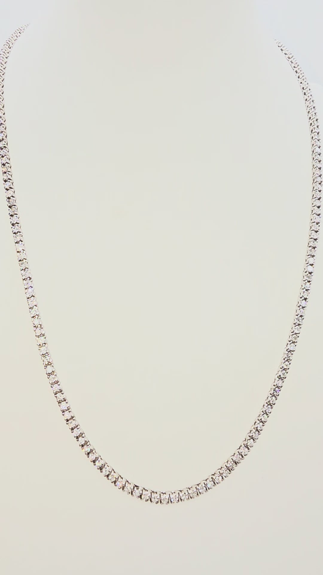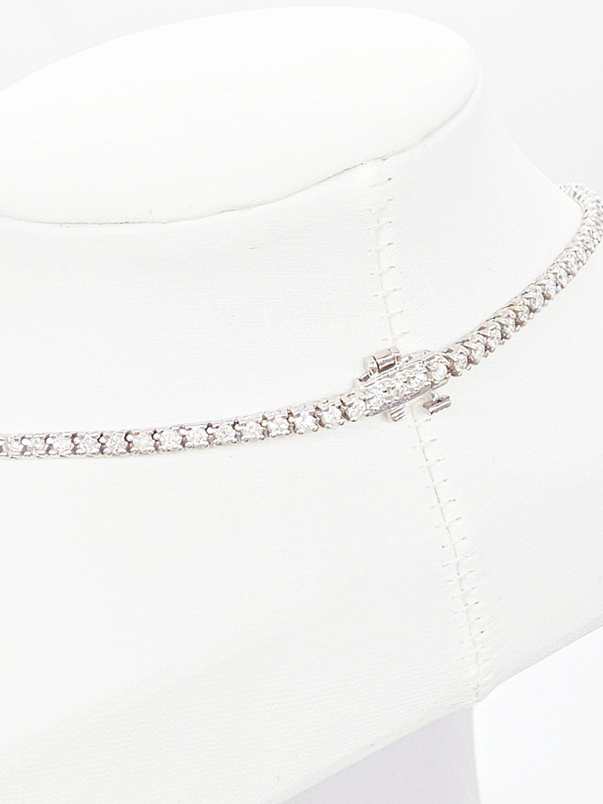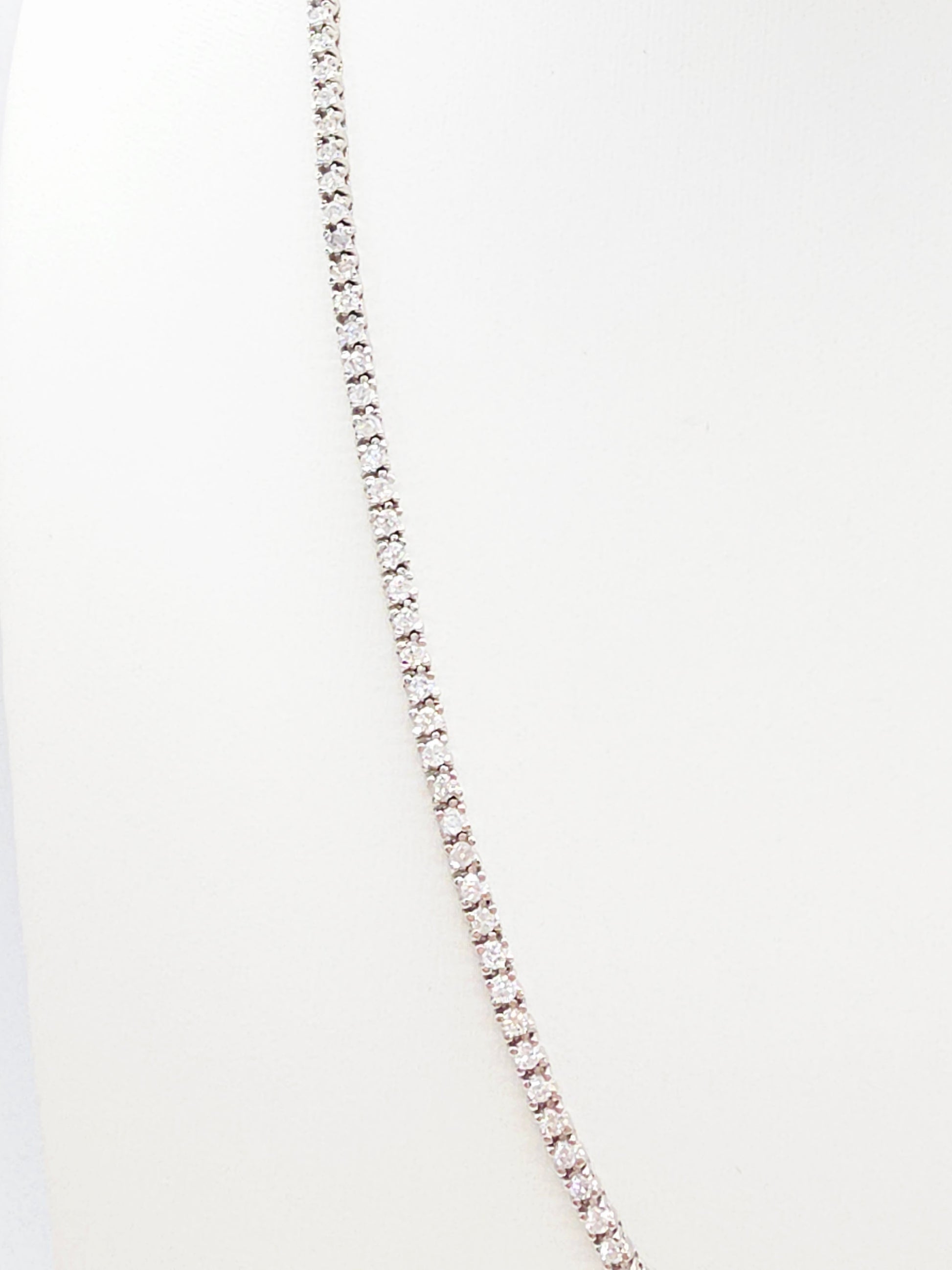 A luxurious and brilliant tennis necklace showcasing 5.18 carats of natural round-brilliant cut white diamonds. Set in solid 14k white gold with a classic four-prong style that maximizes sparkle and light reflection.