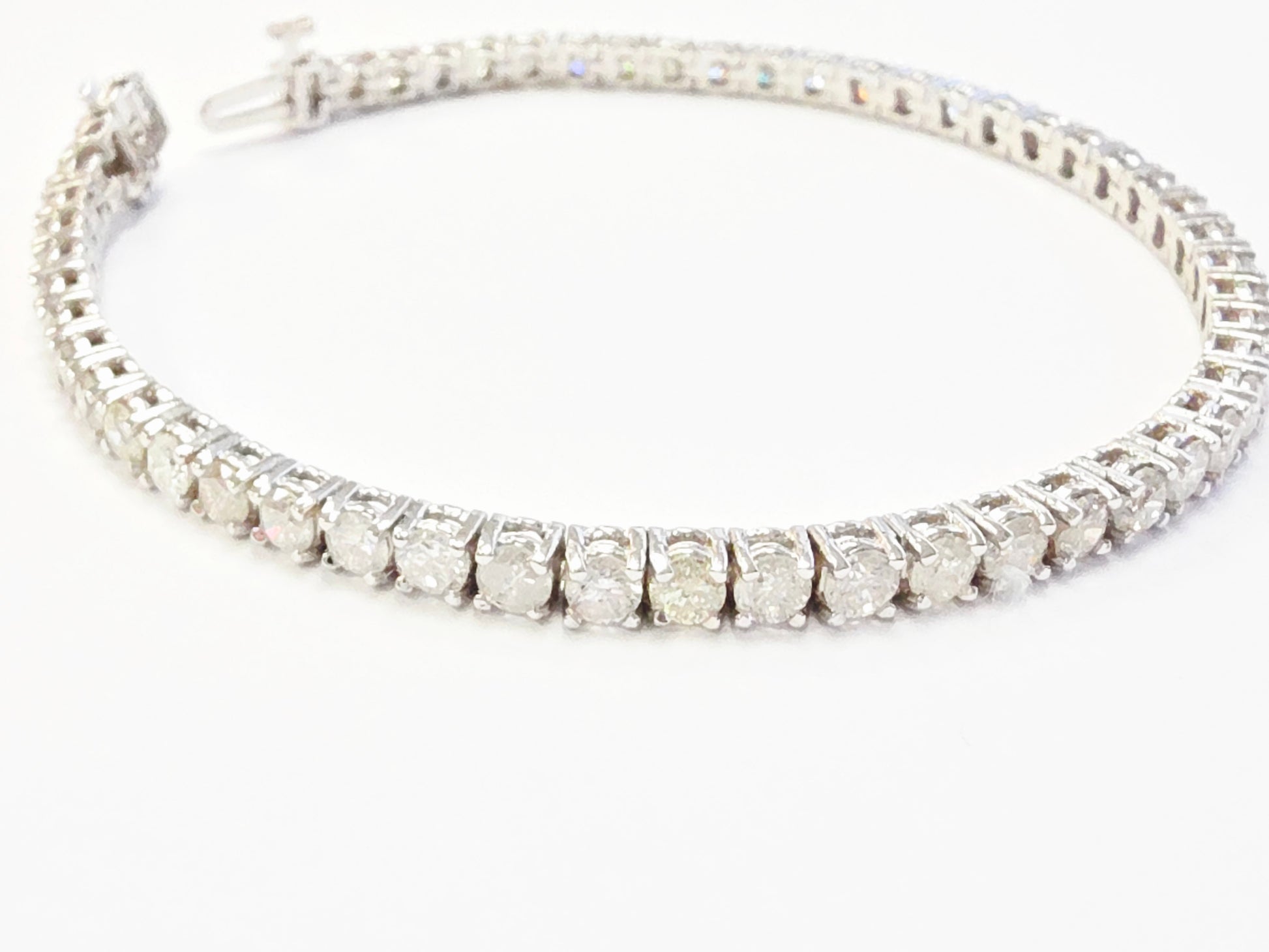 This exquisite tennis bracelet features round brilliant cut white diamonds, known for their exceptional brilliance and sparkle. Set in a classic four-prong style, the diamonds are carefully secured to maximize light reflection for an unmatched shine.