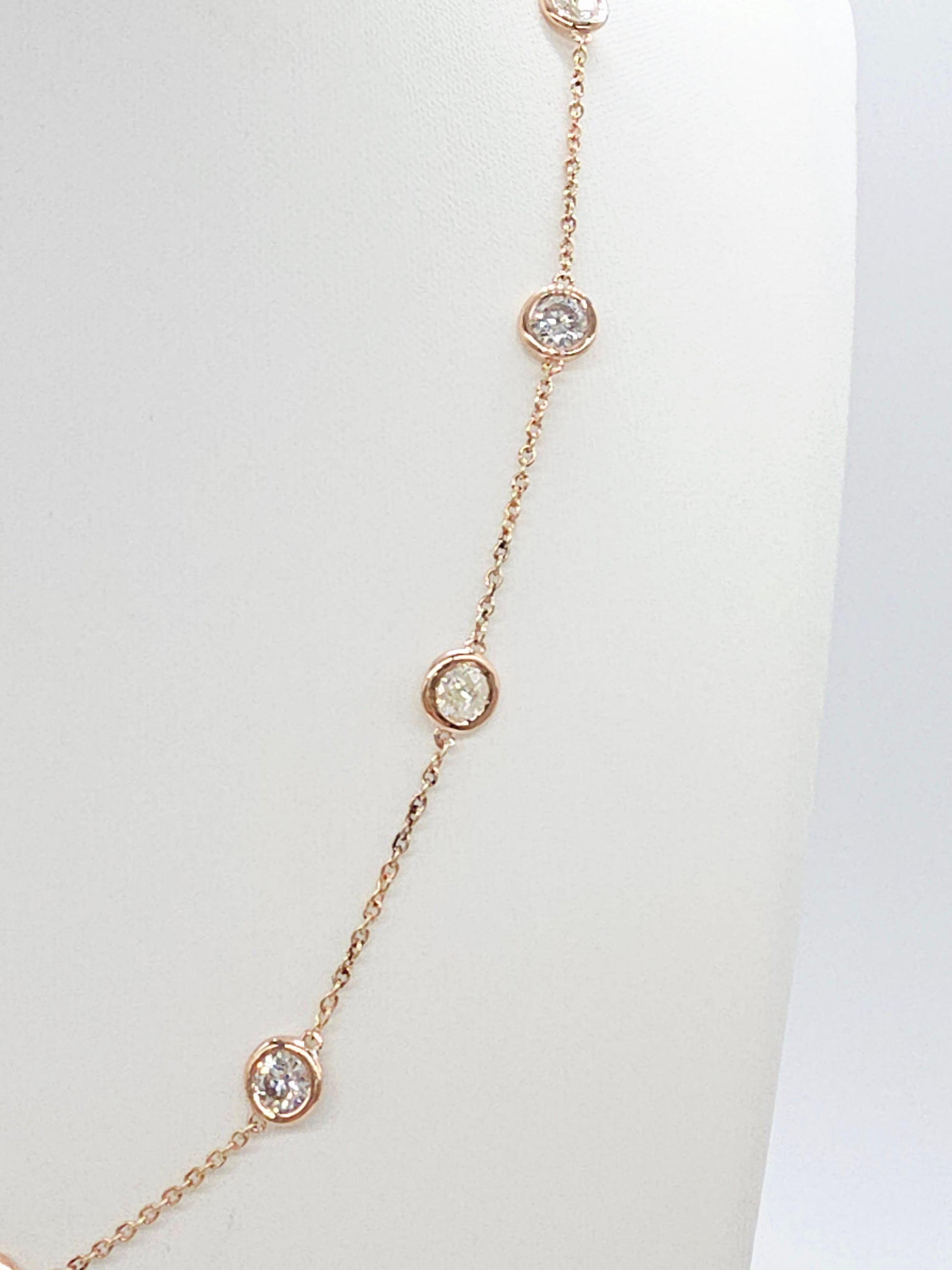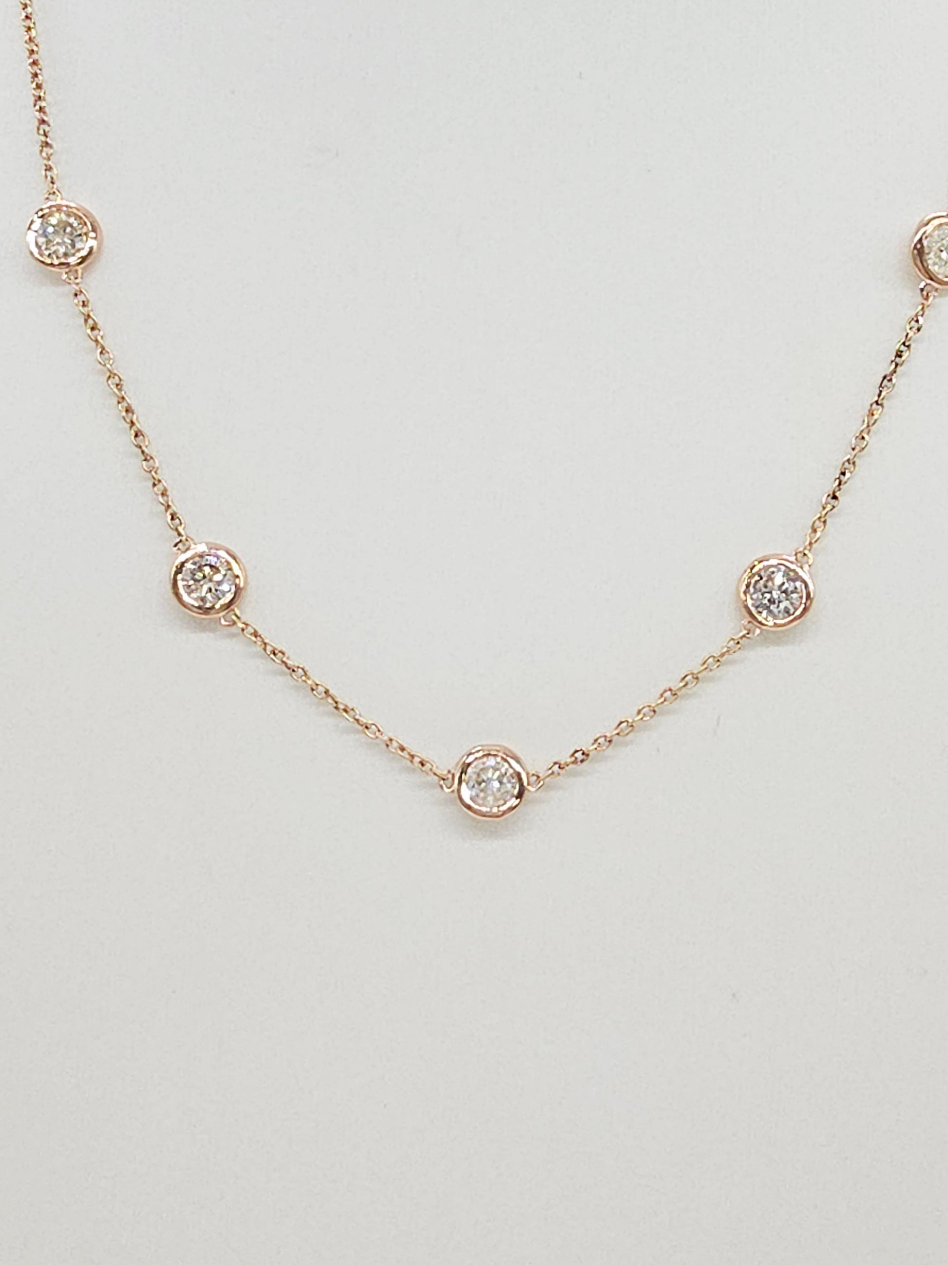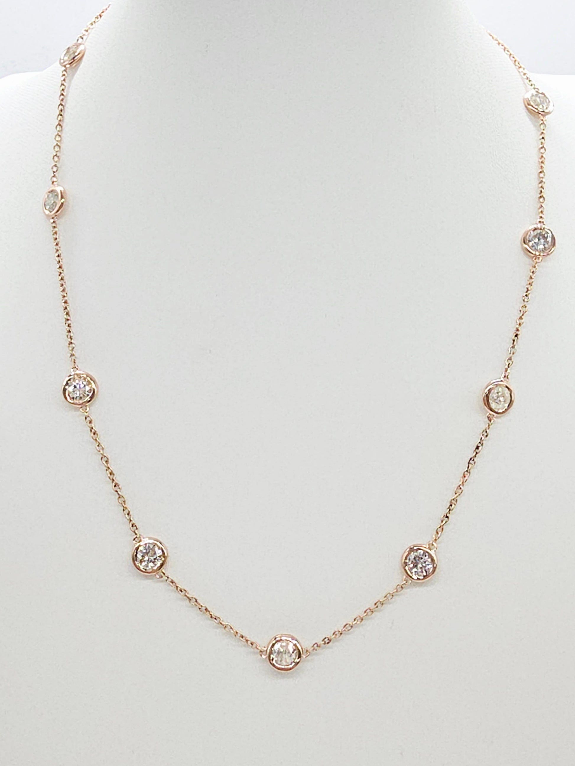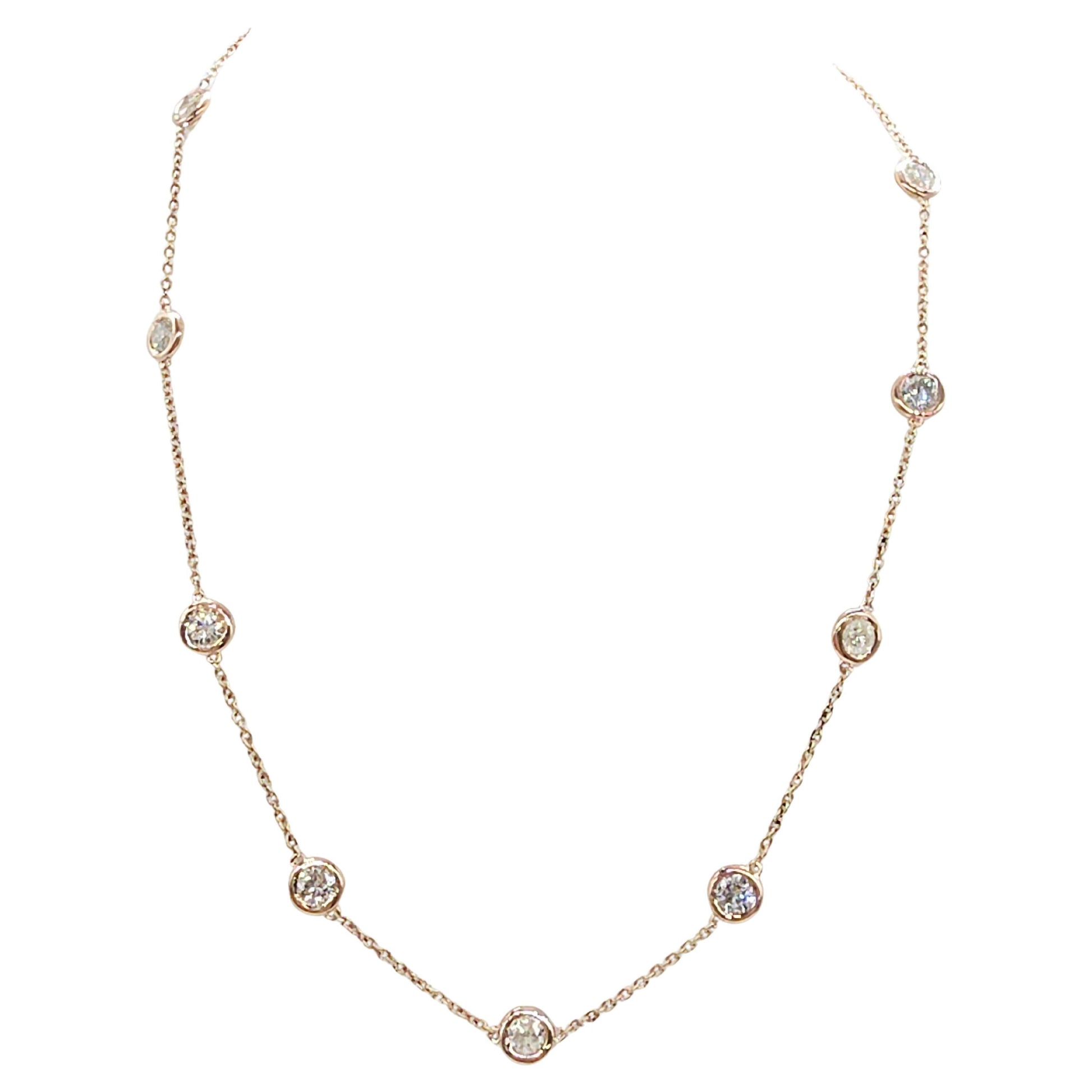 Elegant and timeless diamond by the yard necklace featuring 10 bezel-set natural diamonds totaling 4.15 carats, crafted in Italian-made solid 14K rose gold. The diamonds are evenly spaced along a delicate yet durable chain, offering refined sparkle with a clean, modern silhouette.